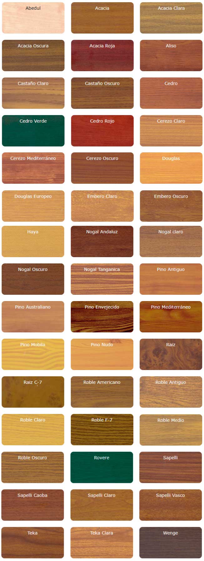 - Nogal Andaluz, claro, oscuro y Tanganica.